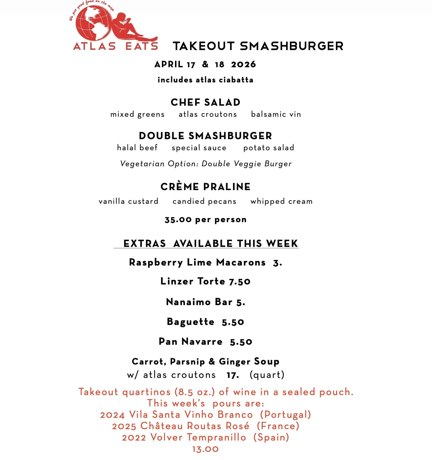Menu is posted Monday. Please have your Visa or MasterCard handy when calling.